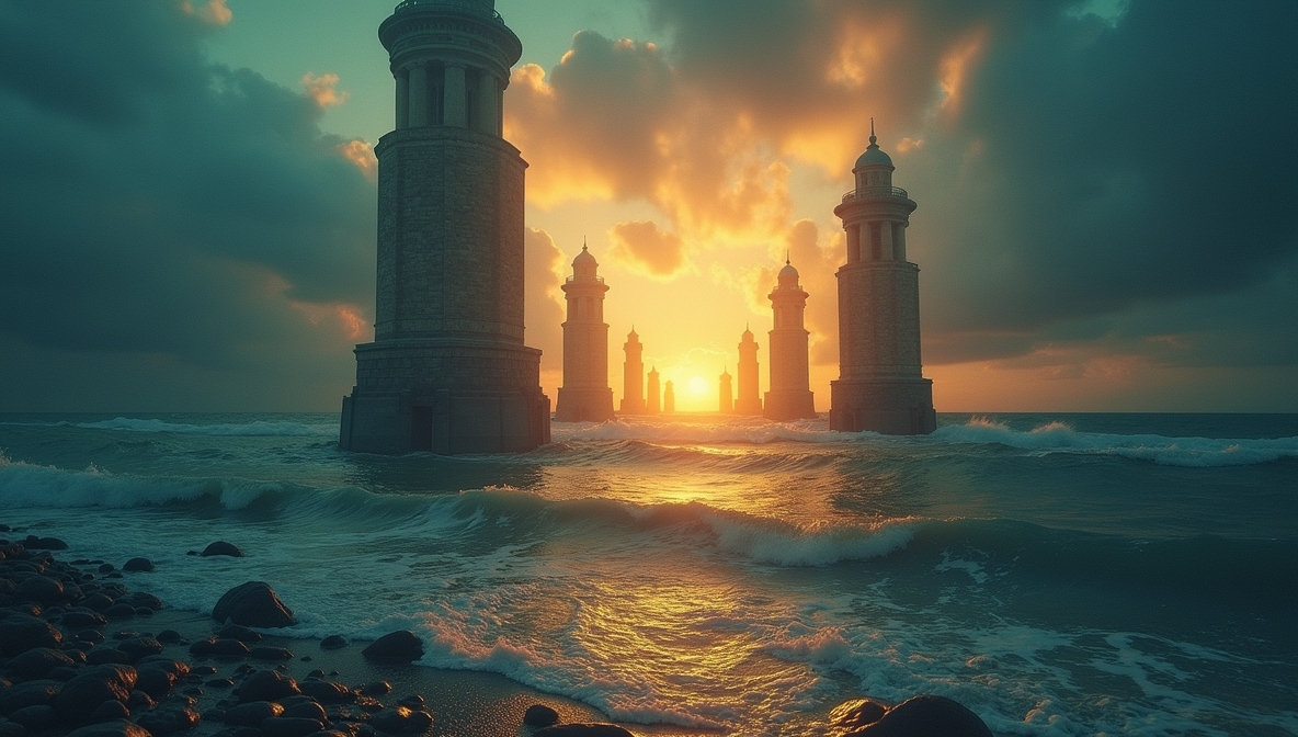 Die ersten Türme der Erinnerung steigen aus dem Wasser, getragen von alten Liedern, Ein Barde im Wind webt Namen Gefallener in das Segel ei…