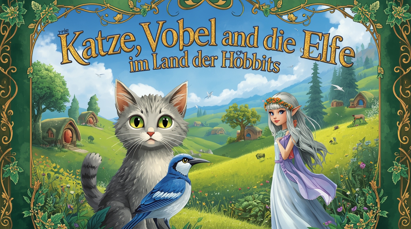 Im grünen Land der Hobbits saßen eine gestreifte Katze, ein kleiner blaugrüner Vogel und eine schimmernde Elfe auf einem moosigen Hügel und…
